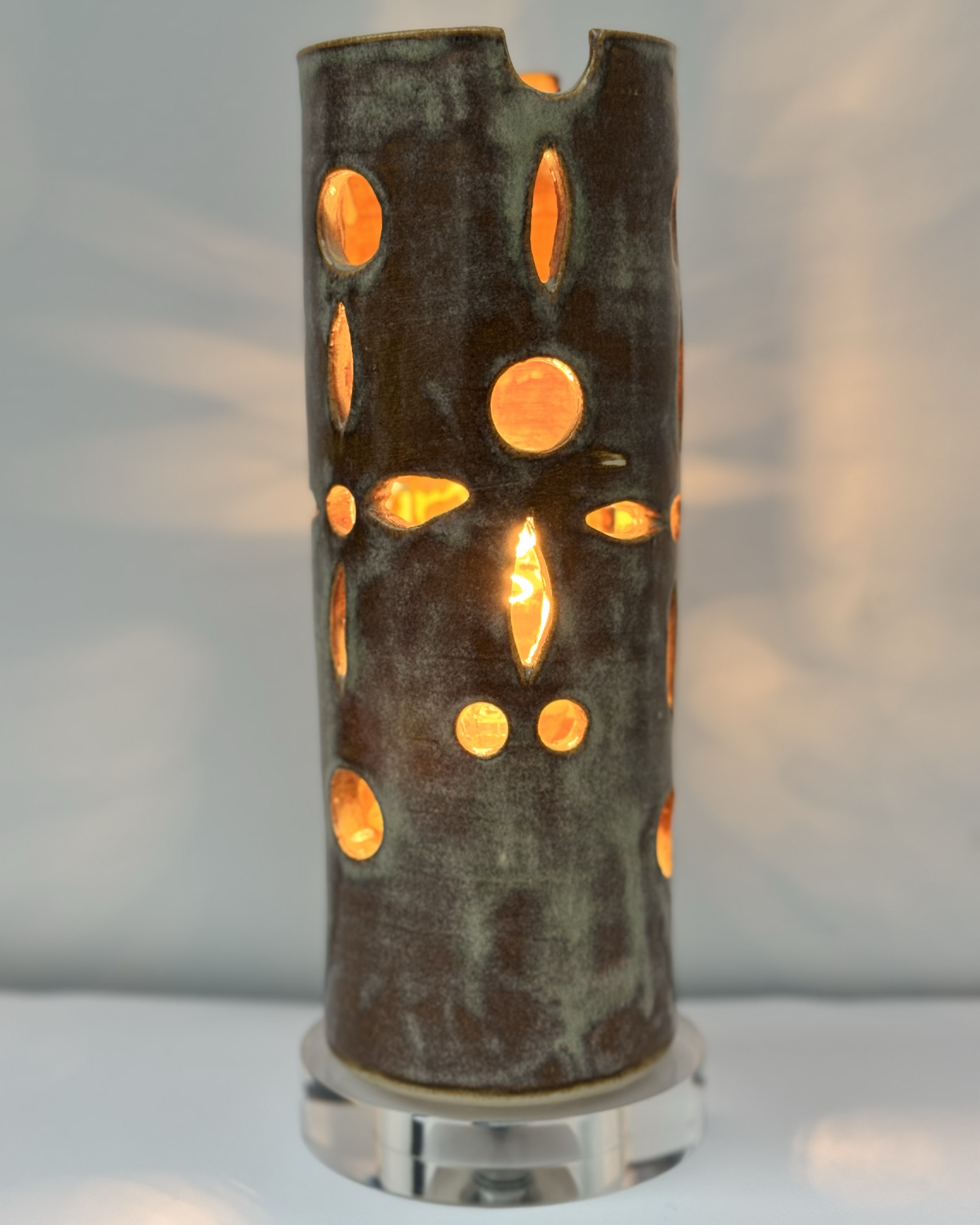 Lightning Bug This little filigree carved 10.5” tall accent lamp glows brightly with its mossy glaze. UL listed wiring with 6’ cord. $75 plus shipping if desired.
